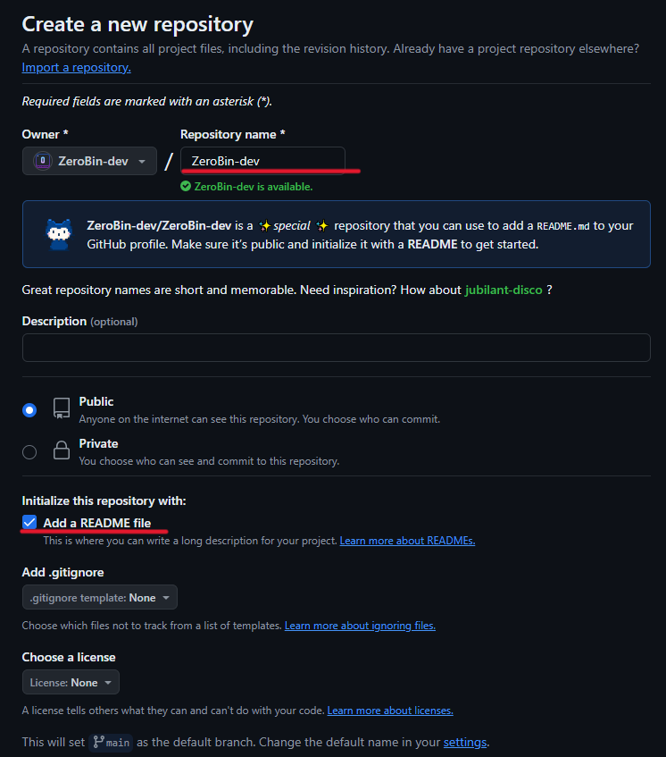 - special repository 문구를 확인 후, "Add a README file"를 체크합니다.
