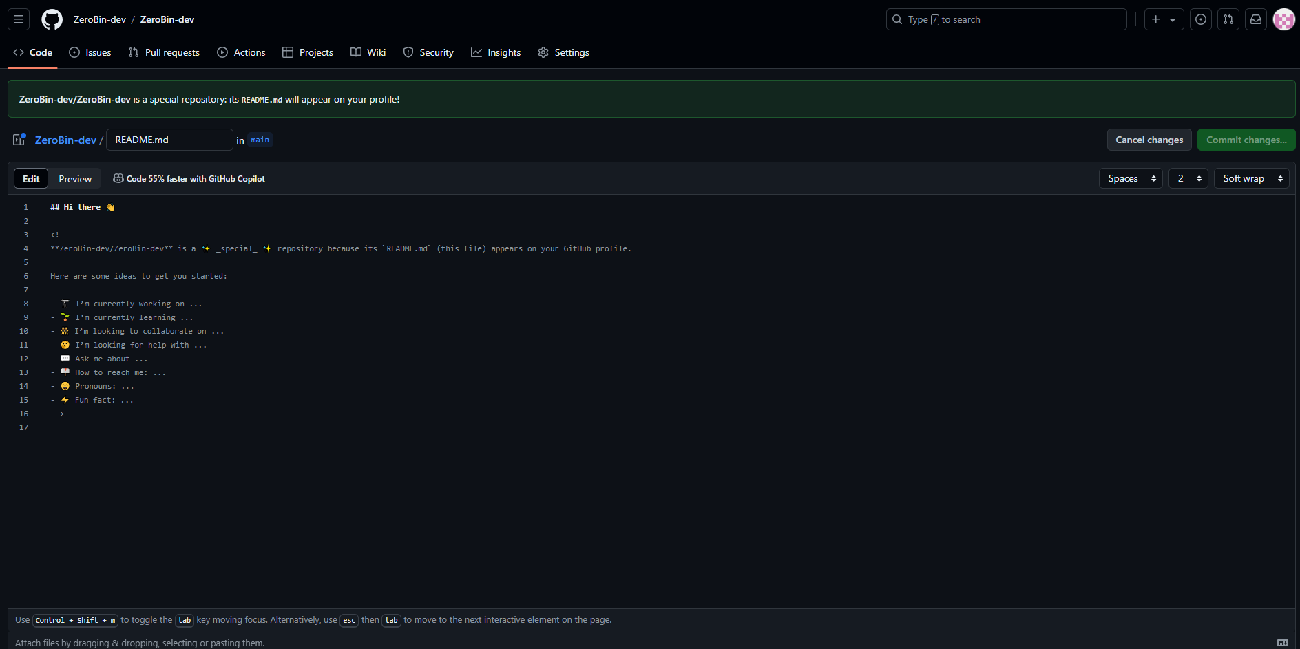 - 위 화면은 기본으로 작성되어 있는 화면으로, 본인의 스타일대로 수정하시고, "Commit changes..."를 클릭하시면 적용이 됩니다.