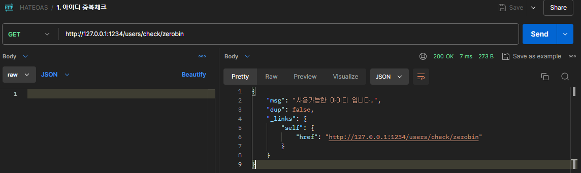 - Self 링크: 각 엔드포인트에서, 해당 엔드포인트를 다시 호출할 수 있는 "self" 링크를 응답에 포함시킵니다. 예를 들어, 아이디 중복 체크 API에서는 linkTo(methodOn(UserController.class).dupCheck(id)).withSelfRel()을 통해 현재 리소스에 대한 "self" 링크를 추가합니다. 이를 통해 클라이언트는 이 API를 다시 호출할 수 있습니다.