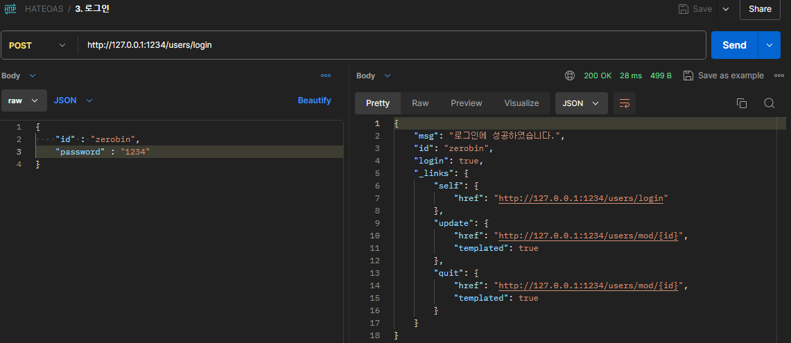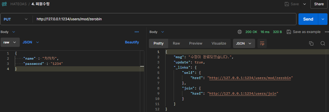 - 관련 리소스 링크: 각 주요 API 응답에는 관련된 다른 리소스에 대한 링크도 포함됩니다. 예를 들어, 회원가입 응답에는 로그인 링크를 포함시켜, 클라이언트가 가입 후 바로 로그인할 수 있도록 유도합니다. 이러한 링크들은 linkTo(methodOn(UserController.class).login(new LoginReq(), request)).withRel("login"))과 같이 추가됩니다.