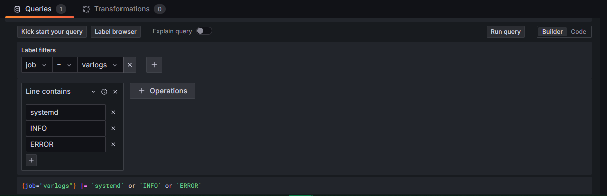 - 쿼리를 작성하시고, "Run query" 버튼을 클릭하시면 대시보드 화면에 로그가 출력됩니다.