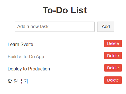 - 삭제: 각 항목의 Delete 버튼 클릭 시 todos에서 해당 항목 제거.