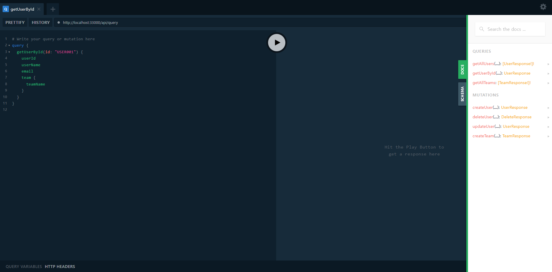 query { getUserById(id: "USER001") { userId userName email team{ teamName }} }