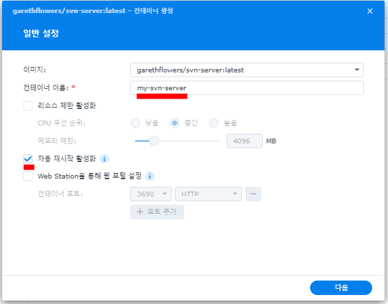 - 컨테이너 이름을 설정하고, 자동 재시작을 활성화합니다.