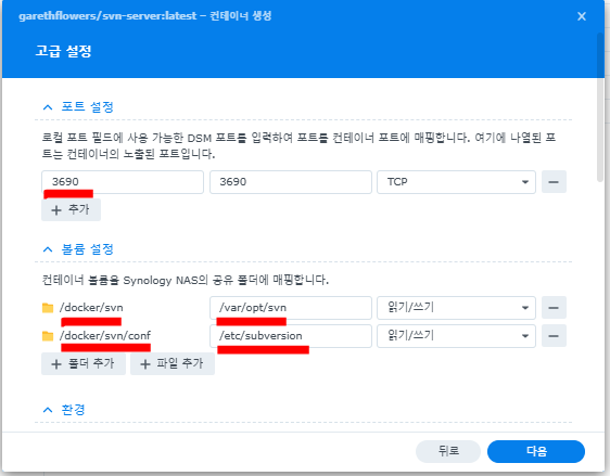 - 로컬포트를 맵핑하고 컨테이너 볼륨을 NAS 공유 폴더에 매핑합니다.