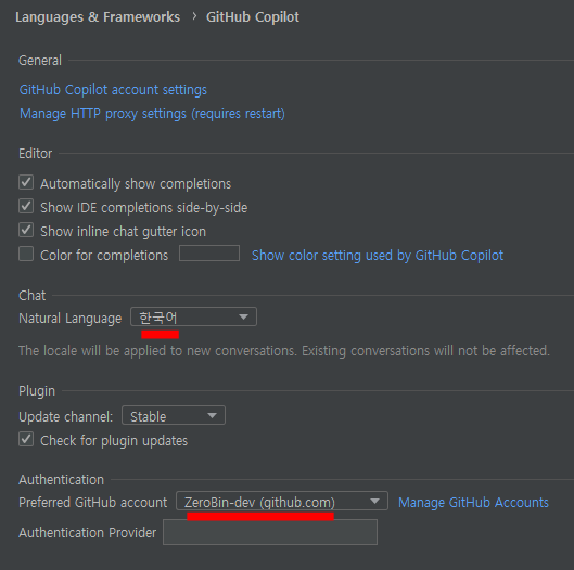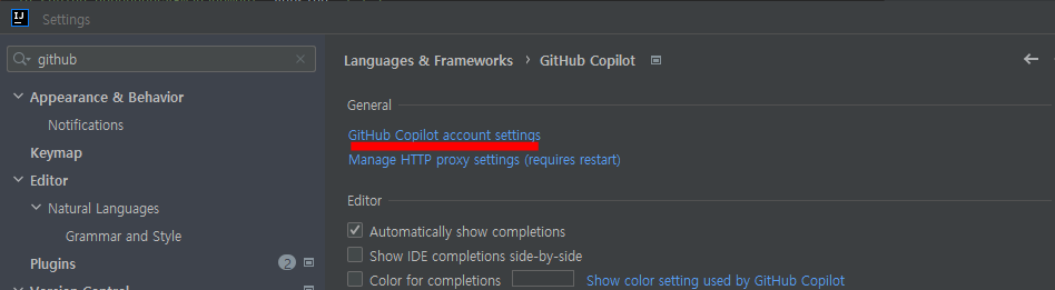 - IDE 로 돌아와서 Settings > Github Copilot 를 찾아 GitHub Copilot account settings 를 클릭합니다.