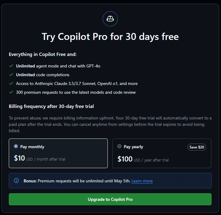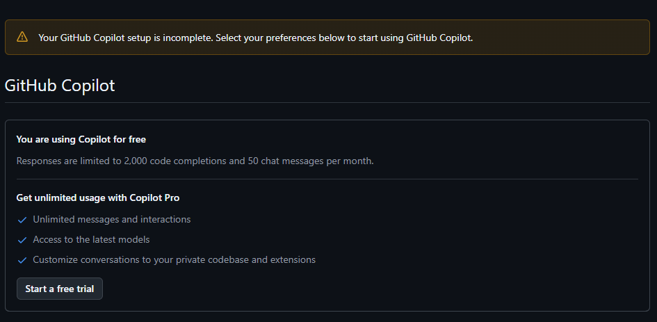 - Github Copilot 은 유료 서비스로, 개인 플랜 또는 비즈니스 플랜을 구독해야 합니다. 이번 포스팅에서는 1달 무료 평가판을 신청하여 진행하도록 하겠습니다.