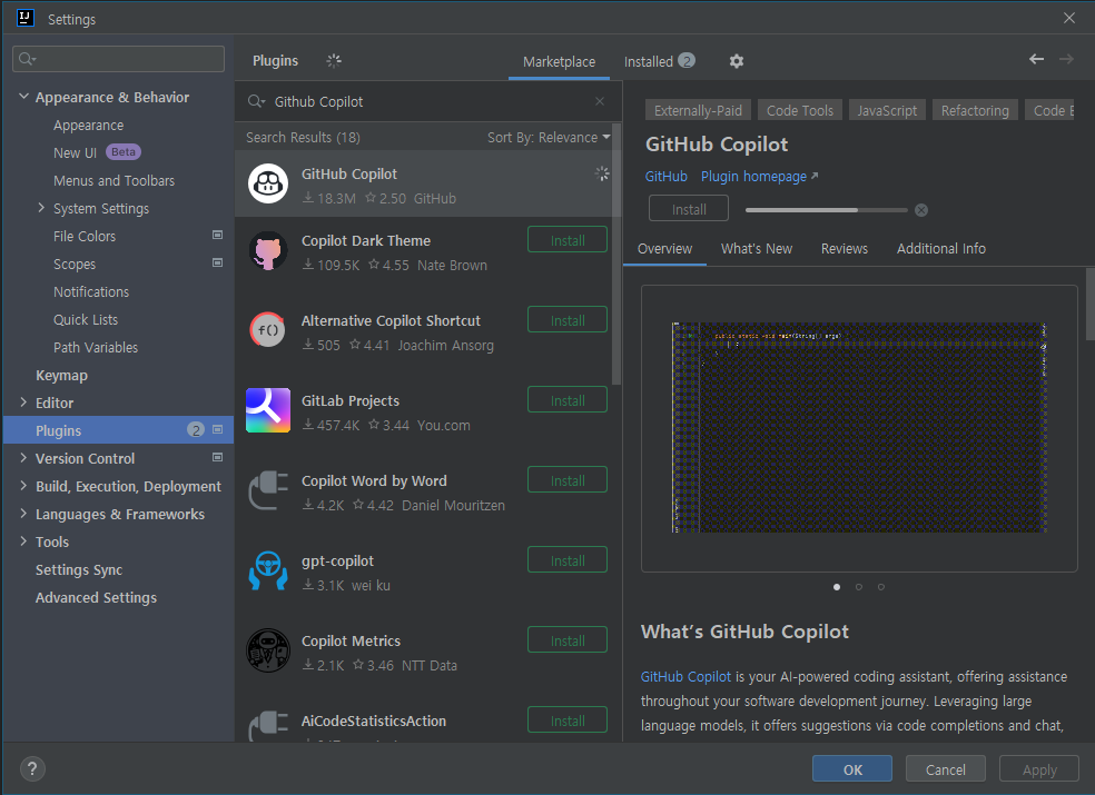 - Marketplace 탭에서 GitHub Copilot을 검색한 후 Install 버튼을 클릭합니다.