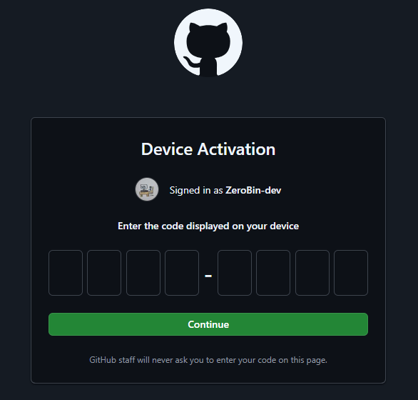 - 브라우저가 열리며 8자리 디바이스 코드가 표시됩니다. 이 코드를 GitHub 웹사이트의 디바이스 인증 페이지에 입력합니다.