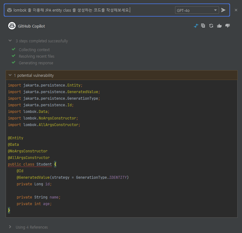 Java, Python, JavaScript 등 다양한 언어를 지원하며, 특히 IntelliJ IDEA 같은 IDE와의 통합이 뛰어나 개발 생산성을 크게 높여줍니다. 예를 들어, "학생 엔티티 클래스를 만들어줘"라는 주석을 쓰면, Copilot이 JPA 어노테이션까지 포함한 코드를 제안해 줍니다. 이 글에서는 Copilot을 IntelliJ에 연결하는 방법과 SpringBoot 프로젝트에서 활용하는 예제를 소개하겠습니다.