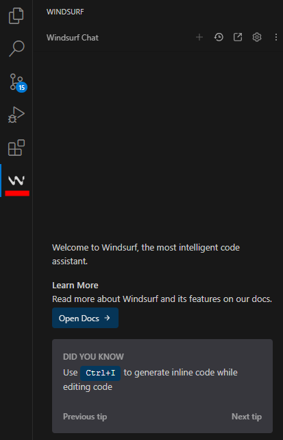 - 좌측 상단 Windsurf 탭이 추가된 모습을 확인할 수 있습니다