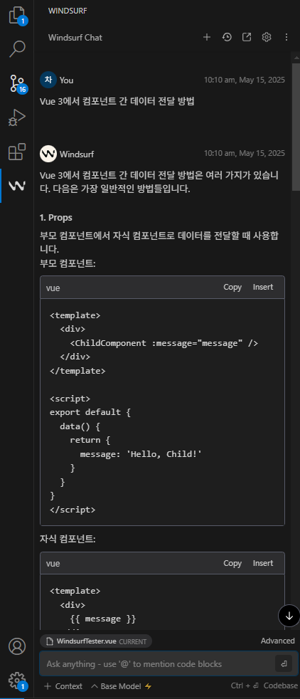 - 채팅으로 질문: “Vue 3에서 컴포넌트 간 데이터 전달 방법”과 같은 질문을 통해 즉각적인 답변과 예시를 확인.