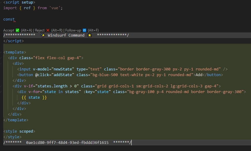 - 명령어로 작업 자동화: Ctrl+I를 눌러 “새로운 반응형 상태 추가”와 같은 명령을 입력.