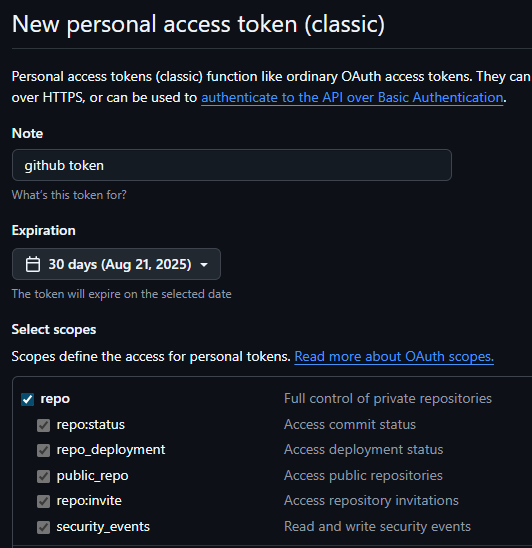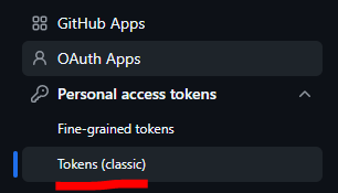 - Personal access tokens > Tokens (classic) 클릭