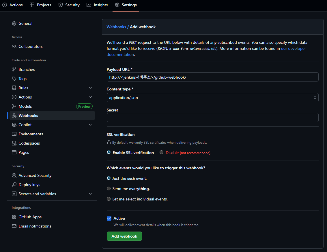 - Payload URL: http://<jenkins서버주소>/github-webhook/
