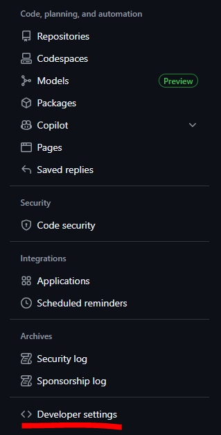 - 좌측 네비게이션 최하단 "Developer settings" 클릭