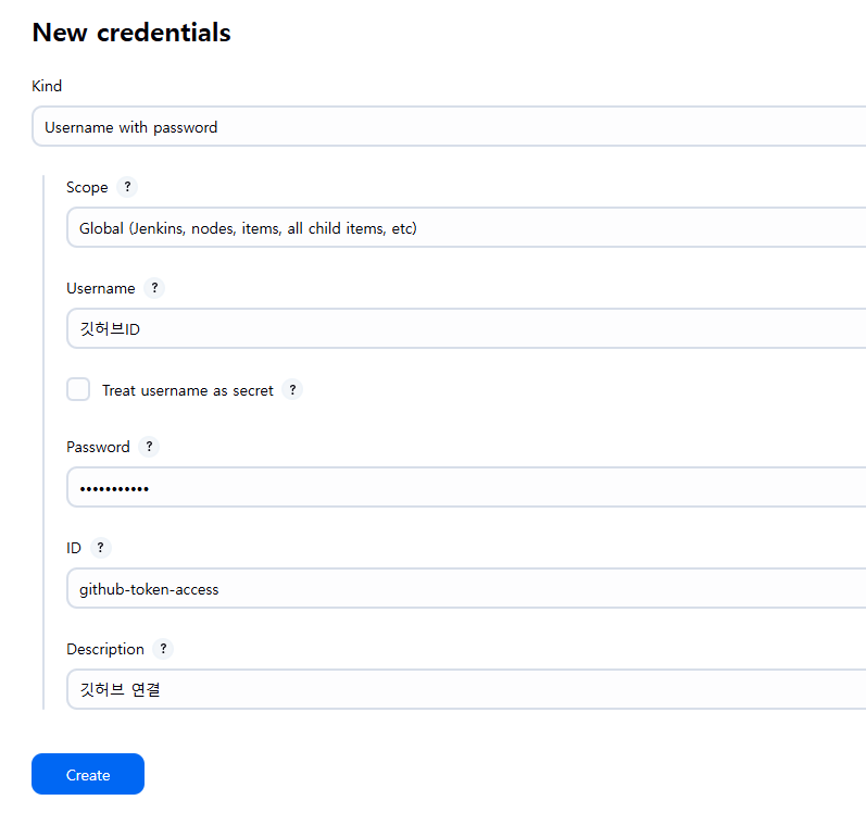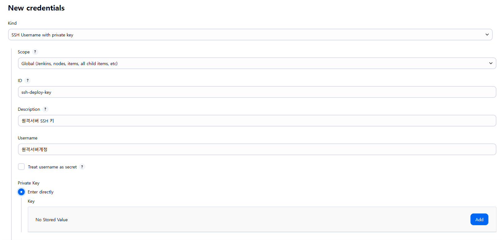 - Jenkins 관리 > Credentials > (Global) > Add Credentials 에서 등록