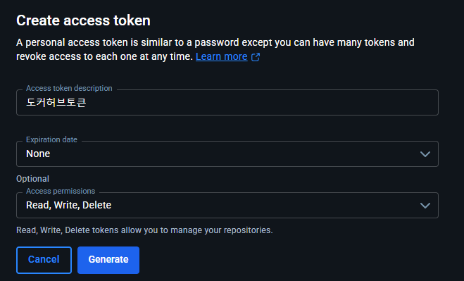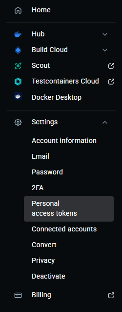 - Dockerhub 로그인 후 좌측 네비게이션바에서 "Personal access tokens" 클릭