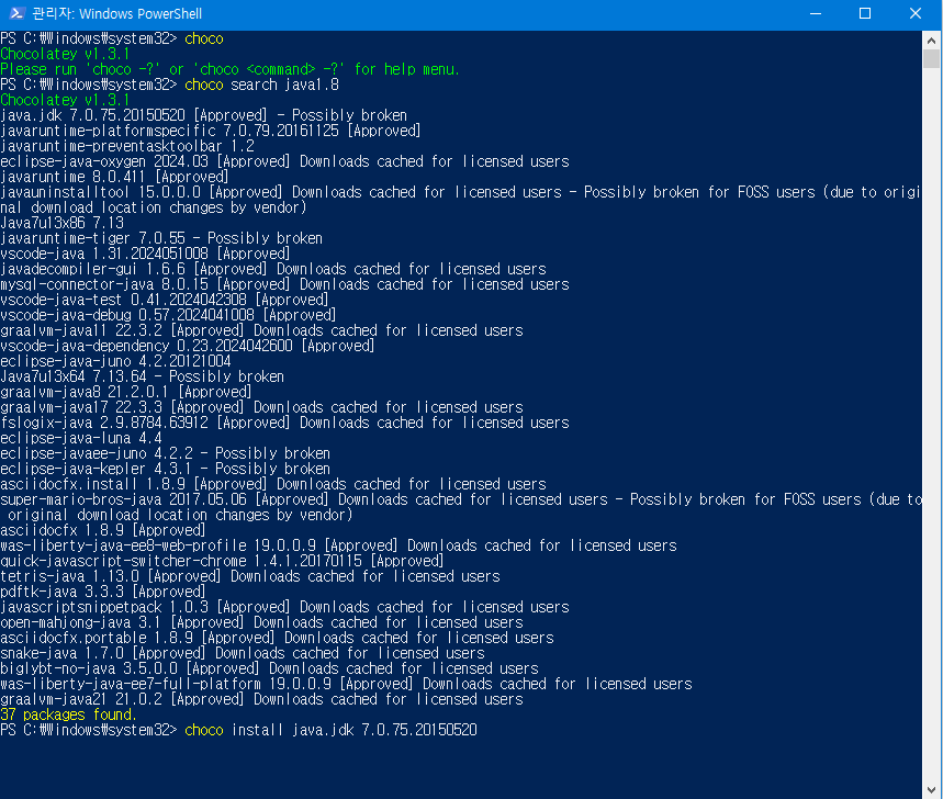 choco 명령어를 입력하여, 정상적으로 설치됐는지 확인 후 'choco search 패키지명'으로 검색 후 'choco install 패키지명'으로 해당 패키지를 다운로드할 수 있습니다.