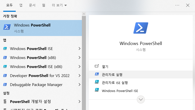 - 윈도우의 Powershell을 관리자 권한으로 실행합니다.