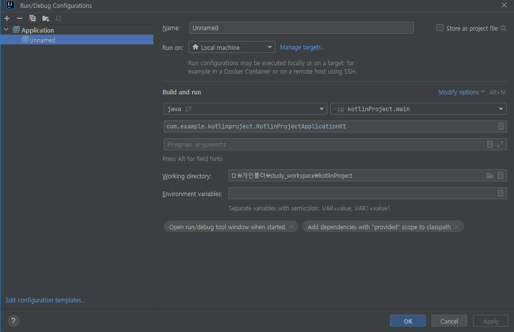 - Run > Run/Debug Configuration 에 들어가 runner 를 설정합니다. "+" 버튼 클릭 > "Application" > Java 버전 지정 > -cp main class 맵핑 후 "OK" 버튼 클릭