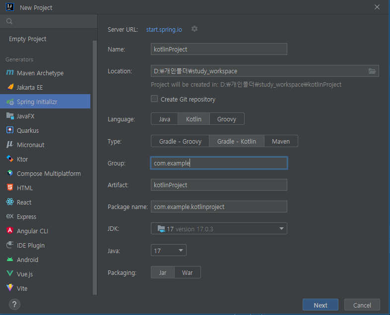 - Spring 이니셜라이저를 이용하여 코틀린을 선택합니다. 참고로 JDK 버전은 주로 LTS(Long Term Support) 버전인 8, 11, 17 버전을 사용하는데, SpringBoot3 에선 17버전이 최소버전이므로 jdk 17 을 선택합니다.