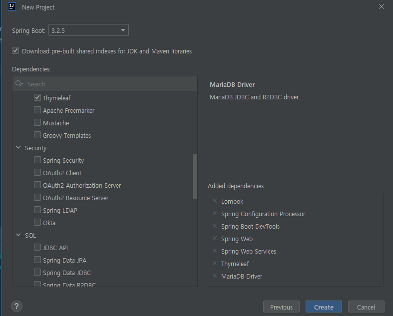 - 필요한 라이브러리들을 꼭 이 창에서 설정할 필요는 없으니, 사용할만한 Dependency 만 추가하고 Create 버튼을 클릭합니다.