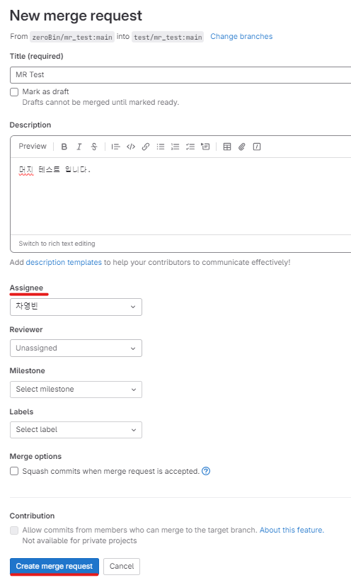 - 승인자를 지정해 주고 "Create merge request" 버튼을 클릭합니다.