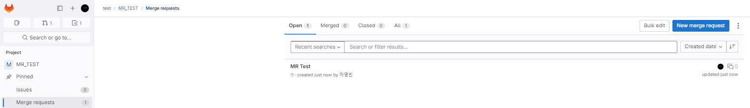 - 승인자의 계정으로 접속해 Merge requests 탭으로 이동하면 MR을 확인 할 수 있습니다.