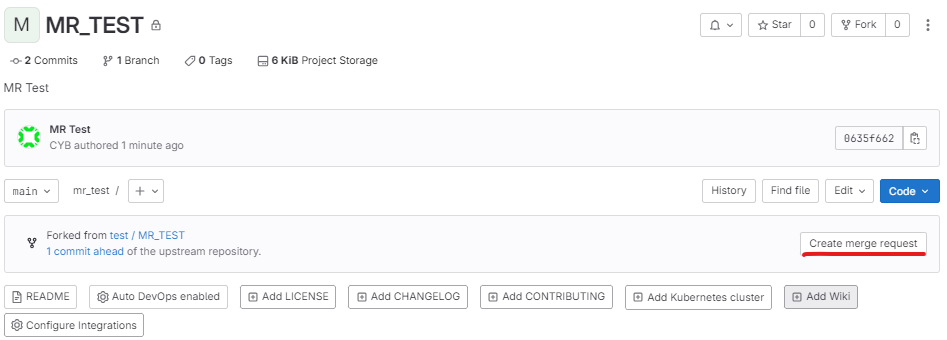 - Gitlab 에서 본인의 Fork 프로젝트를 들어가 보면 "Create merge request" 버튼이 활성화되어 있습니다. 버튼을 클릭합니다.